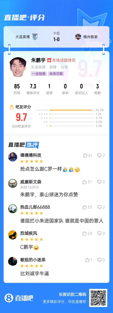 本轮中超,朱鹏宇一击制胜,帮助大连英博1-0战胜梅州客家。