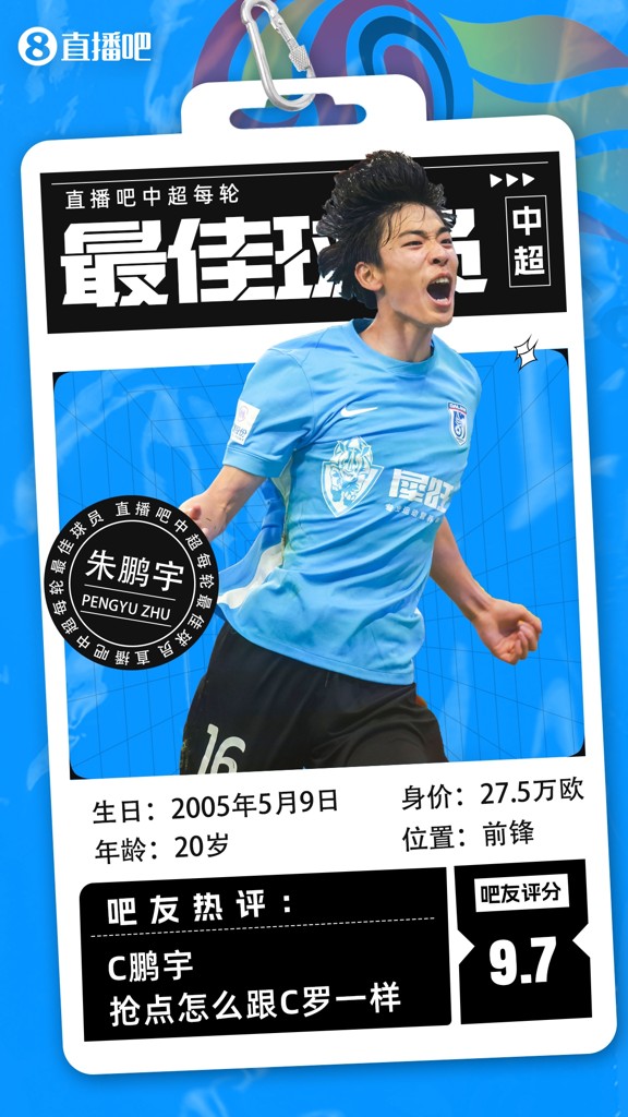【】中超第14轮最佳球员评选出炉,20岁的朱鹏宇击败弗兰克和杜加利奇,首次当选本轮最佳!