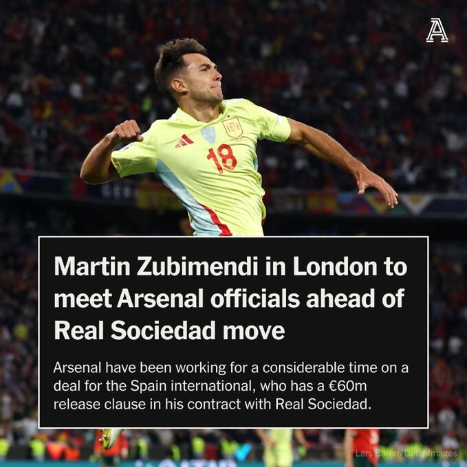 TA的报道指出,祖比门迪正在伦敦与阿森纳官员见面,并完成他从皇家社会转会至阿森纳的手续。阿森纳为签下祖比门迪已经努力了很长时间,他与皇家社会的合同中包含6000万欧元(5170万英镑)的解约金条款。