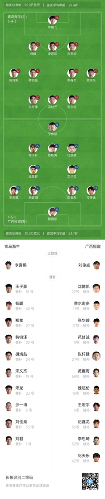 青岛海牛替补:1-刘君、22-韩镕泽、5-沙一博、18-王子豪、19-宋文杰、23-宋龙、24-胡靖航、27-郑龙、33-刘佳燊、42-杨聪