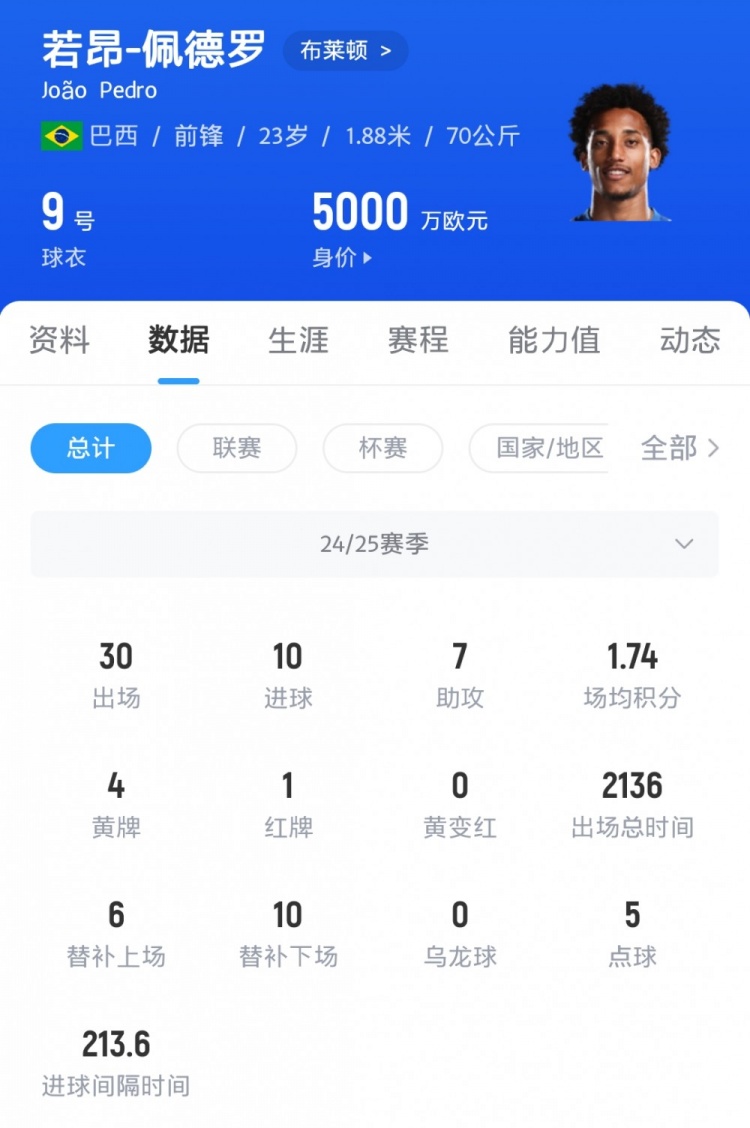 6月28日讯 《镜报》报道了布莱顿前锋若昂-佩德罗的转会消息,切尔西和纽卡斯尔都对他有意,而布莱顿对6000万英镑转会费的价格十分坚持。