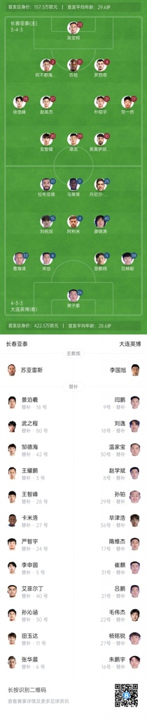 07月27日讯 北京时间今晚19点,中超第18轮,长春亚泰主场迎战大连英博,赛前双方公布首发阵容。